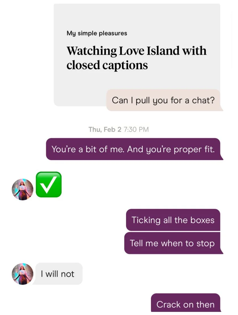David sends Kelly a message on the dating app Hinge. He uses a classic line from Love Island.
